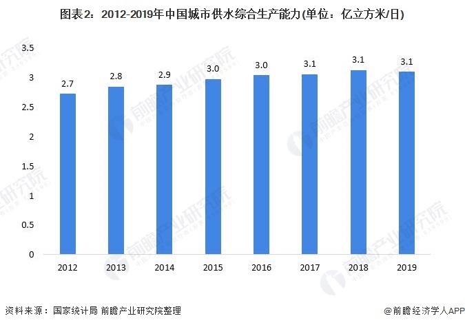 隨著我國(guó)城市用水人口穩(wěn)健,我國(guó)城市供水能力也持續(xù)提高。2012-2018年我國(guó)城市供水綜合生產(chǎn)能力持續(xù)上升,2019年有所下降,為3.09億立方米/日,較2018年下降1.04%。