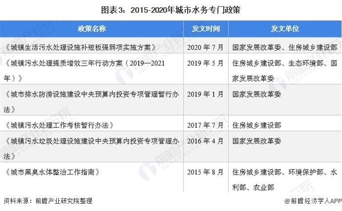 隨著城市用水人口的增長(zhǎng),我國(guó)城市水務(wù)面臨較大的供給壓力,因此國(guó)家十分注重城市水務(wù)的發(fā)展,近年來(lái)發(fā)布了一系列相關(guān)政策,特別是污水治理方面。其中《城鎮(zhèn)污水處理提質(zhì)增效三年行動(dòng)方案(2019—2021年)》指出,目標(biāo)經(jīng)過(guò)3年努力,地級(jí)及以上城市建成區(qū)基本無(wú)生活污水直排口,基本消除城中村、老舊城區(qū)和城鄉(xiāng)結(jié)合部生活污水收集處理設(shè)施空白區(qū),基本消除黑臭水體,城市生活污水集中收集效能顯著提高。