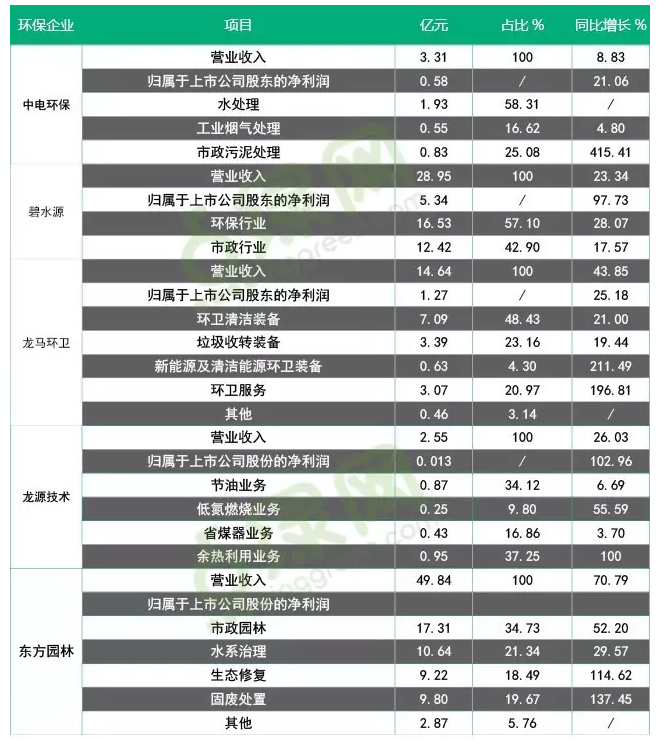 上半年?duì)I收同比增長(zhǎng)最多的前三名企業(yè)分別為東方園林70.79%、億利潔能58.42%、維爾利55.90%。在凈利潤(rùn)方面,則由博天環(huán)境147.58%、科融環(huán)境108.03%和龍?jiān)醇夹g(shù)102.96%博得前三名。
