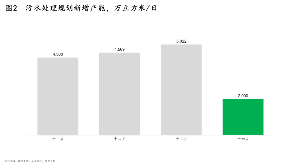 一是污水處理日漸成熟。近年我國城鎮(zhèn)污水處理任務已基本完成,城市污水處理率已經(jīng)達到95%以上,在“十四五”規(guī)劃中的污水處理新增產(chǎn)能也出現(xiàn)明顯下降(見圖2)。在污水處理漸趨飽和的情況下,先前遭到忽視的污泥處理問題重新得到關(guān)注。