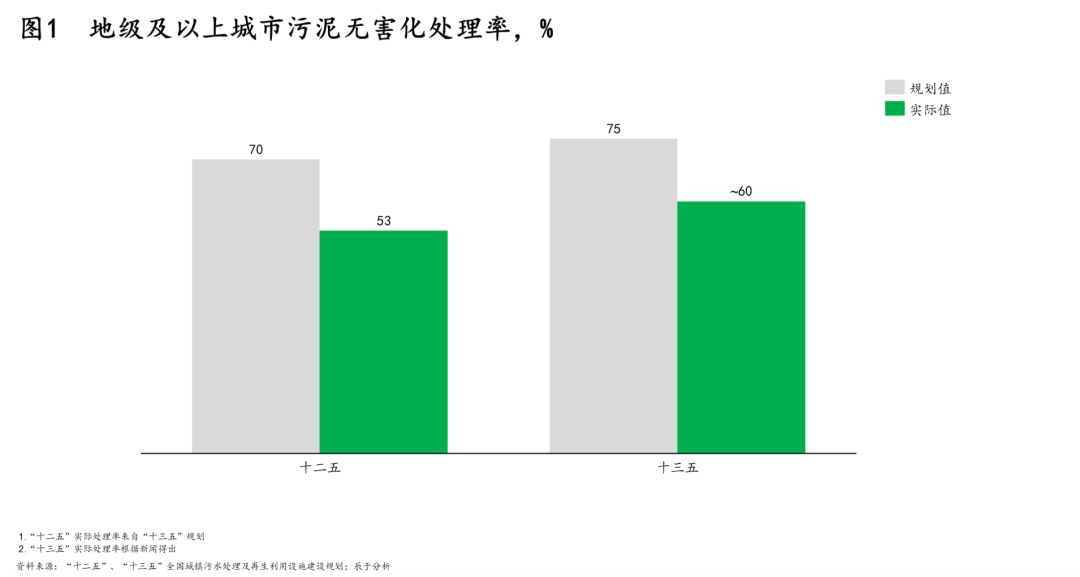 在此背景下,各級政府最終選擇先將污泥處理放一放,將有限資金優(yōu)先用于污水處理設施和管網(wǎng)建設,這導致國內(nèi)“重水輕泥”的傾向明顯,“十二五”和“十三五”規(guī)劃中的地級及以上城市污泥無害化處理率目標兩次落空也就見怪不怪了(見圖1)。