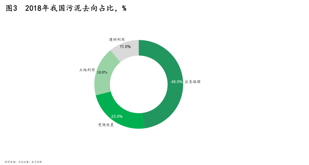 在這樣的條件下,大部分地區(qū)對污泥處理以最便利的填埋為主。以2018年為例,我國污泥去向近半成為應急填埋(見圖3),盡管填埋并非最合適的污泥處理方式:占用土地面積大,場地不宜尋找;往往治標不治本,因污泥含有重金屬及病菌,遇水極易造成二次污染,包括有害成分滲漏造成地下水污染、污泥中的營養(yǎng)物質(zhì)使大量病原菌滋生繁衍等。