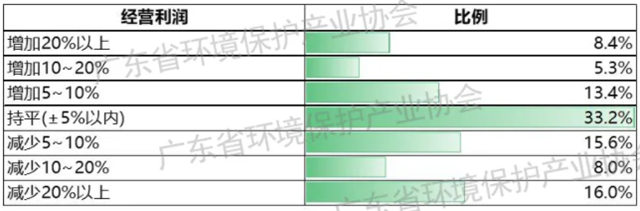 營(yíng)業(yè)利潤(rùn)方面,29.1%的環(huán)保企業(yè)實(shí)現(xiàn)利潤(rùn)同比增長(zhǎng),32.8%的企業(yè)利潤(rùn)與上年同期持平,38.1%的企業(yè)利潤(rùn)下降。