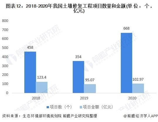 2020年全國(guó)正式啟動(dòng)土壤修復(fù)工程項(xiàng)目668個(gè),總項(xiàng)目金額約為102.97億元,覆蓋全國(guó)除西藏、港澳臺(tái)以外的30個(gè)省(市、區(qū))。與2019年相比,項(xiàng)目金額增長(zhǎng)8.31%,項(xiàng)目數(shù)量從354個(gè)項(xiàng)目增加到668個(gè)項(xiàng)目,數(shù)量增加非常明顯。近三年全國(guó)土壤修復(fù)工程市場(chǎng)總金額總體較為穩(wěn)定,近兩年基本維持在一百億元左右。