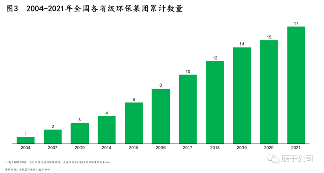 從“十二五”開始,就有地方生態(tài)環(huán)保集團成立,但“十三五”中后期至今頻率明顯變高。例如,初步統(tǒng)計已有超過20家省級生態(tài)環(huán)保集團,大多都是在“十三五”后期成立的,大概每年都會有2——3家(見圖3)。
