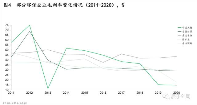 因此,地方政府一方面想辦法壓低項目盈利水平降低投入,一方面尋求其他“合法”融資渠道解困。近年來大型生態(tài)環(huán)保企業(yè)的盈利水平逐步下降印證了項目盈利降低的趨勢(見圖),盈利就幾個點,融資成本極低的大型國企、央企在競爭中處于優(yōu)勢,幾個點的融資成本決定了項目的成與否;尋找融資渠道下,地方生態(tài)環(huán)保集團應(yīng)運而生,對跨市統(tǒng)籌、投資公益性回報比較差的項目等,將起到積極的作用。