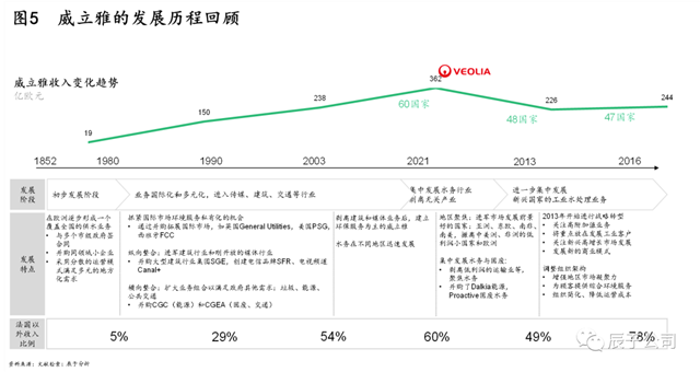 任何大企業(yè)的長成都不是一日之功,全球生態(tài)環(huán)保巨頭威立雅的發(fā)展之路照樣坎坷,歷經(jīng)160年發(fā)展,直到上世紀80年代后才真正開始走上快速發(fā)展的道路,經(jīng)歷了之后30年的擴張(見圖5)。