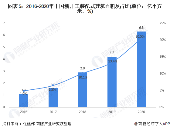 隨著各地積極推進(jìn)裝配式建筑項(xiàng)目落地,我國(guó)新建裝配式建筑規(guī)模不斷壯大。截至2020年末,全國(guó)31個(gè)省、自治區(qū)、直轄市和新疆生產(chǎn)建設(shè)兵團(tuán)新開工裝配式建筑共計(jì)6.3億平方米,較2019年增長(zhǎng)50%,占新建建筑面積的比例約為20.5%。