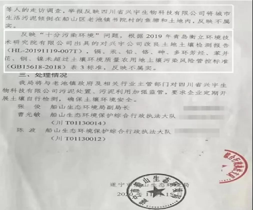 遂寧為什么會(huì)出現(xiàn)如此嚴(yán)重的污泥非法填埋問題?與監(jiān)管失職有關(guān)。據(jù)了解,對(duì)于新景源環(huán)保的污泥非法處置問題,周邊群眾反映非常強(qiáng)烈。2015年以來,該問題先后被群眾投訴過14次。但是,當(dāng)?shù)叵嚓P(guān)職能部門嚴(yán)重失職失責(zé),既不認(rèn)真調(diào)查處理群眾投訴問題,也不按規(guī)定查處新景源環(huán)保的違法行為,導(dǎo)致企業(yè)有恃無恐,問題愈演愈烈。不光是群眾投訴沒人理,就連相關(guān)政府部門的投訴也起不到作用。2019年7月,船山區(qū)老池鎮(zhèn)政府曾經(jīng)分別致函船山區(qū)住建、生態(tài)環(huán)境等部門,請(qǐng)求調(diào)查處理該企業(yè)違法問題,但相關(guān)部門不聞不問,放任問題長期存在。特別是2020年11月,四川省省級(jí)生態(tài)環(huán)保督察進(jìn)駐遂寧市期間,群眾再次投訴該公司非法傾倒填埋污泥問題,但是船山區(qū)卻回復(fù)謊稱群眾反映問題不屬實(shí)。遂寧市也未經(jīng)認(rèn)真核實(shí)就原樣轉(zhuǎn)報(bào)調(diào)查結(jié)論,導(dǎo)致問題依然未能得到及時(shí)解決。船山區(qū)向省級(jí)督察組回復(fù)謊稱群眾反映問題不屬實(shí)▼