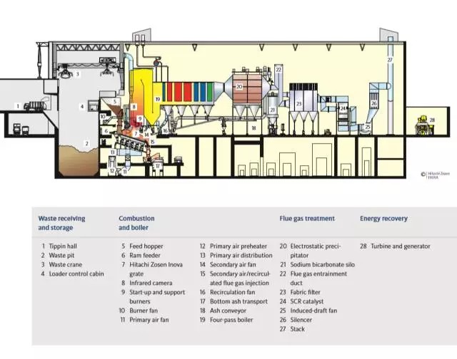 工藝:下圖是電廠工作原理的示意圖,通過這個示意圖可以看到,那些超級樹的管狀物,都是垃圾焚燒廠的排氣管道。