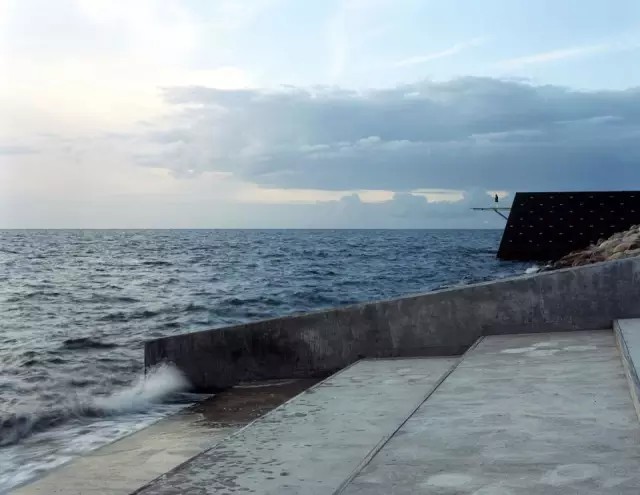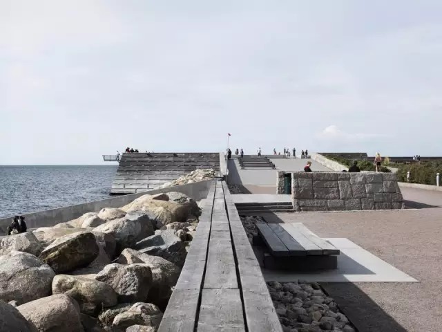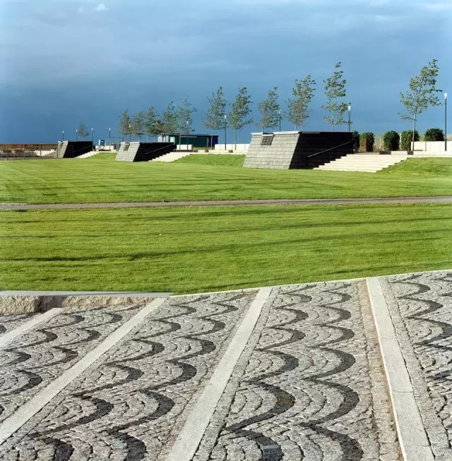 Dania濱海公園位于瑞典和丹麥分界處的?resund海峽一側。該公園是原馬爾默海岸西部港口改造工程的主要項目之一,也是瑞典國內對城市用地進行開發(fā)再利用的最為雄心勃勃的項目之一。該用地曾經是寸草不生的垃圾填埋場;是一片充斥著臟污不堪的淤泥的工業(yè)荒漠。起初,難以定義的基地條件給設計師帶來了不小的困難,最終那些自然的瞬息萬變的元素反而構成了設計的主角:光、風、大海、地面線以及一望無際的遠景。這是一片隨季節(jié)和氣候變化的場所,人們在這里可以體驗巖石的堅硬與海浪的兇悍,體驗落日的壯美與夏日的明媚。公園最重要的組成要素是被稱為“Scouts(瞭望臺)”的部分:三個傾斜的混凝土臺,嵌入到巖石組成的海岸線中,讓來到公園的人們可以深入大海。40X40m的被稱為“堡壘”的平臺,比海平面高6m,無論是強烈的海風還是壯美的落日,只要站在這里都能暢快地體驗。此外,三個木箱組成的“陽臺”提供了俯瞰廣闊草坪的場所。后者是一塊絕佳的室外活動場地,兩排高地錯落的樹木及耐鹽灌木將強烈的海風阻隔在外。