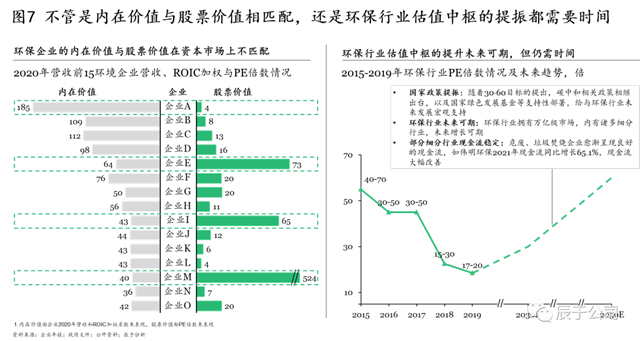 但必須承認(rèn)的是,向好趨勢的背后,我國資本市場的制度完善仍需時間。首先是生態(tài)環(huán)保企業(yè)內(nèi)在價值與股票價值的相匹配需要時間,在對生態(tài)環(huán)保企業(yè)2020年?duì)I收前15強(qiáng)的營收、ROIC加權(quán)和PE倍數(shù)進(jìn)行分析得到,多數(shù)企業(yè)(如企業(yè)A、E、I、M)的內(nèi)在價值與股票價值在資本市場上并不匹配。其次是生態(tài)環(huán)保估值中樞的提升仍需時日,盡管隨著國家政策的提振、生態(tài)環(huán)保行業(yè)的發(fā)展、部分細(xì)分行業(yè)企業(yè)現(xiàn)金流狀況的改善,環(huán)保估值中樞提升未來可期,但也并不是一蹴而就的(見圖7)。