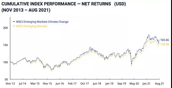 圖2 MSCI新興市場指數(shù)氣候變化累積指數(shù)表現(xiàn)-凈回報(美元)(2013.11-2021.8)
