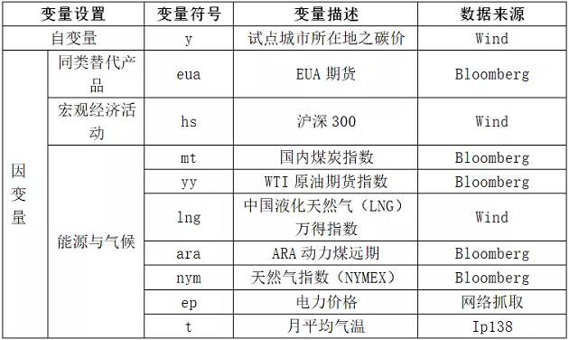 回顧上述文獻可以發(fā)現(xiàn),多數(shù)國內(nèi)外學者的研究證實了同類替代品、宏觀經(jīng)濟活動、能源與氣候變化會對碳價有較為顯著的影響。為了進一步探究這一系列影響因素對碳價的共同影響,并比較其相關(guān)性,本文將在這三個層面選取部分代表性指標,并將其聯(lián)立以分析影響結(jié)果。