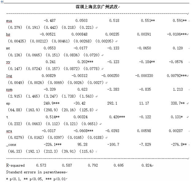 在篩選掉缺失數(shù)據(jù)并統(tǒng)一時間與貨幣單位后,本文最終對深圳、上海、北京、廣東、以及湖北在2017年1月至2021年1月這四年間的日度數(shù)據(jù)進行回歸。研究發(fā)現(xiàn),五次回歸模型在F檢驗中的P值均<0.01,可見此模型均在0.01水平上是有效的。其次,深圳、上海、北京、廣東、以及湖北在以一系列應(yīng)變量的回歸模型中R方分別為0.5730、0.5871、0.7920、0.6952、0.8243,盡管相對于宏觀層面R方的大小并不是很大,但具有一定的解釋意義。