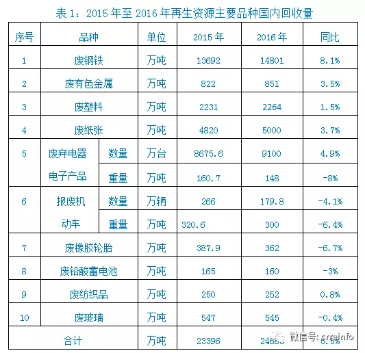 1、回收量。在宏觀經(jīng)濟(jì)形勢(shì)總體下行的背景下,再生資源回收行業(yè)總體規(guī)模不但沒有出現(xiàn)大幅下滑,而且有了一定幅度的增長(zhǎng)。據(jù)中再生協(xié)會(huì)統(tǒng)計(jì)顯示,2016年,廢鋼、廢有色金屬、廢塑料、廢紙、廢棄電器電子產(chǎn)品、報(bào)廢汽車、廢橡膠輪胎、廢鉛酸蓄電池、廢紡織品、廢玻璃等10個(gè)主要品種國(guó)內(nèi)回收量2.47億噸(見表1),比2015年同比增長(zhǎng)5.5%。