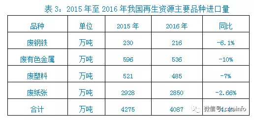 3、進(jìn)口量。2016年,我國(guó)廢鋼鐵、廢有色金屬、廢塑料、廢紙4個(gè)品種的進(jìn)口量達(dá)4087萬(wàn)噸,比2015年同比下降4.4%(見表3)。進(jìn)口量同比下降的原因,是環(huán)保監(jiān)管趨嚴(yán),國(guó)家收緊固廢進(jìn)口政策。