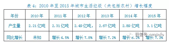 4、近五年全國(guó)城市生活垃圾增長(zhǎng)幅度。中再生協(xié)會(huì)專家組通過(guò)實(shí)地調(diào)研及查閱相關(guān)部門資料發(fā)現(xiàn),2010年,全國(guó)城市生活垃圾產(chǎn)生量2.21億噸,到2015年,全國(guó)城市生活垃圾產(chǎn)生量增長(zhǎng)到3.1億噸,5年間城市生活垃圾平均年增長(zhǎng)7.54%,其中2014年比2013年同比增長(zhǎng)8.2%(見表4)。
