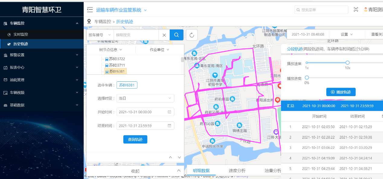通過對(duì)環(huán)衛(wèi)作業(yè)人員、時(shí)間、地點(diǎn)、設(shè)備使用情況等各種數(shù)據(jù)的統(tǒng)計(jì)和分析,不僅能夠幫助管理者從全局把控環(huán)衛(wèi)概況,還可為后續(xù)指揮決策提供系統(tǒng)的數(shù)據(jù)支撐,保證決策的高效性和科學(xué)性。