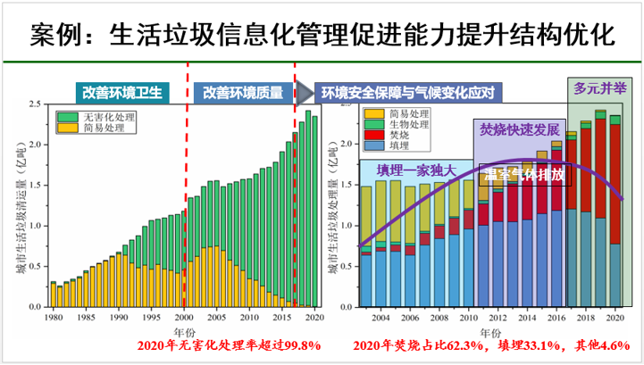 產(chǎn)生多少固廢都不清楚的情況下怎么計(jì)算減碳?劉建國(guó)表示,固廢治理首先需要借助新一代信息化技術(shù)把底數(shù)摸清楚。城市生活垃圾板塊就做了很好的示范,數(shù)據(jù)從過(guò)去的粗放狀態(tài)到近年越來(lái)越逼近真實(shí),數(shù)據(jù)呈現(xiàn)也越來(lái)越清晰。2020年城市生活垃圾無(wú)害化處理率超過(guò)99.8%,其中焚燒占比62.3%,填埋33.1%,其他4.6%,城市生活垃圾處理方式從填埋一家獨(dú)大到焚燒快速發(fā)展再到現(xiàn)在多元并舉,管理水平的提升帶來(lái)了垃圾處理方式的進(jìn)步,從最初環(huán)境衛(wèi)生問(wèn)題的解決到環(huán)境質(zhì)量問(wèn)題的解決,再到現(xiàn)在環(huán)境安全問(wèn)題和氣侯變化的應(yīng)對(duì),其中精細(xì)化管理和信息化管理發(fā)揮了很重要的作用。