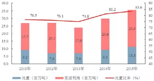 2011-2015年中國工業(yè)危險(xiǎn)廢物處理情況