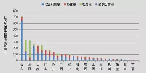 目前,國內(nèi)工業(yè)危險(xiǎn)廢物產(chǎn)生量大部分集中在東部、西北部工業(yè)化地區(qū)。根據(jù)環(huán)保局的統(tǒng)計(jì)數(shù)據(jù)顯示,2014年,各地區(qū)工業(yè)危險(xiǎn)廢物產(chǎn)生量較大的省份為山東709.8萬噸,占全國工業(yè)企業(yè)危險(xiǎn)廢物產(chǎn)生量的19.5%;青海325.7萬噸,占全國工業(yè)企業(yè)的9.0%;新疆319.3萬噸,占全國工業(yè)企業(yè)的8.8%;湖南260.6萬噸,占全國工業(yè)企業(yè)的7.2%;江蘇243.3萬噸,占全國工業(yè)企業(yè)的 6.7%。下圖是2014年我國工業(yè)危險(xiǎn)廢物的地區(qū)處理情況: