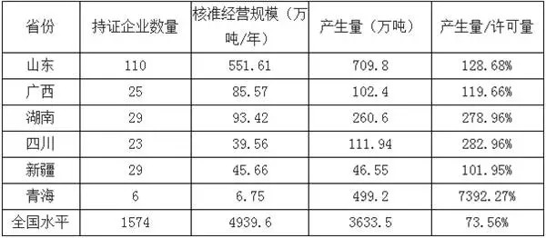 危廢產(chǎn)生量超出核準(zhǔn)經(jīng)營規(guī)模的省份(2014年)