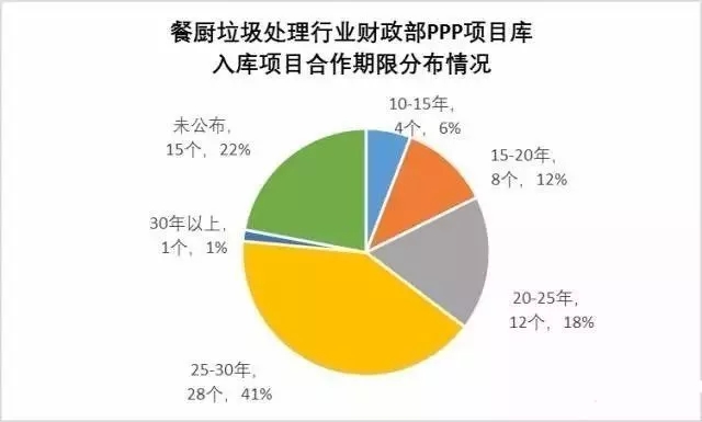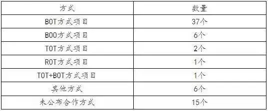 項目合作期限呈現(xiàn)短期、長期少,中期多的分布,這與其他行業(yè)PPP項目的分布形態(tài)基本一致,另外還有15個項目尚未識別完畢或不再推進(jìn),未公布合作期限。