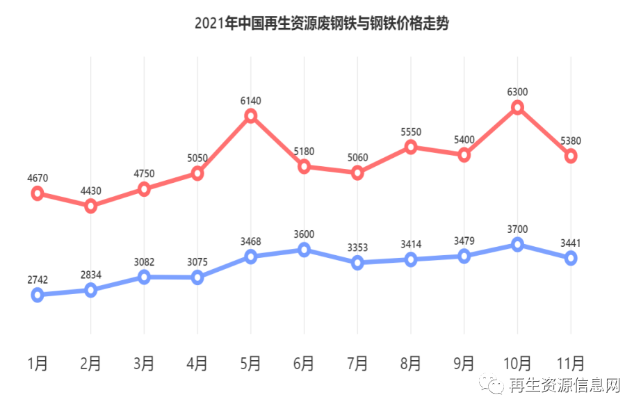 圖6 2021年我國再生資源廢鋼鐵與鋼鐵價格走勢圖