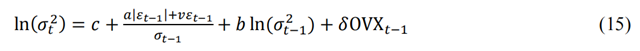 使用EGARCH模型考察原油市場波動對EUA市場影響時,發(fā)現(xiàn)在正態(tài)分布、t分布、GED分布三種假設(shè)下,OVX的系數(shù)全部顯著為正,表示原油價格波動的上升會導(dǎo)致EUA市場波動的增加,引起排放價格下降。