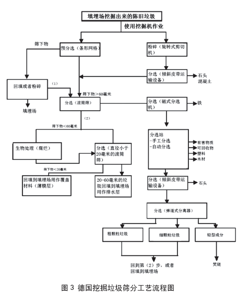 德國使用挖掘機(jī)對3米厚的覆土層的固體垃圾進(jìn)行開采。一般固體垃圾通過孔徑為60毫米的滾筒篩。大件垃圾在放置于滾筒篩上之前被粉碎。在滾筒篩之后,形成了粒度在0到60毫米之間的部分。用滾筒篩進(jìn)一步篩分,產(chǎn)生了粒度在0到20毫米之間的細(xì)顆粒垃圾和粒度在20到60毫米之間的部分。小于20毫米的細(xì)顆粒垃圾回填到填埋場,用作覆蓋材料。20到60毫米的部分回填到填埋場,用作填埋場的排水層。德國挖掘垃圾篩分工藝見圖3。