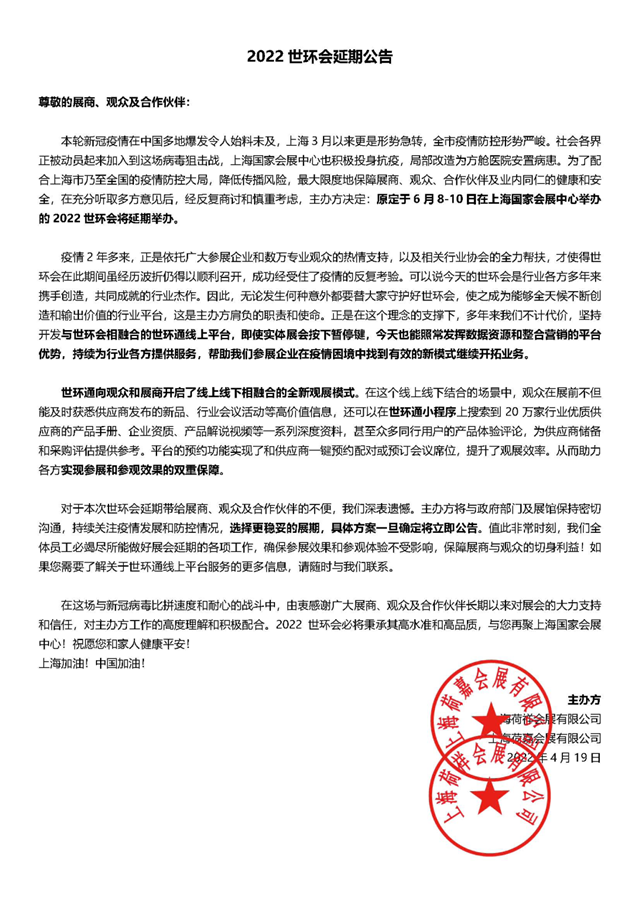 本輪新冠疫情在中國(guó)多地爆發(fā)令人始料未及,上海3月以來(lái)更是形勢(shì)急轉(zhuǎn),全市疫情防控形勢(shì)嚴(yán)峻。社會(huì)各界正被動(dòng)員起來(lái)加入到這場(chǎng)病毒狙擊戰(zhàn),上海國(guó)家會(huì)展中心也積極投身抗疫,局部改造為方艙醫(yī)院安置病患。為了配合上海市乃至全國(guó)的疫情防控大局,降低傳播風(fēng)險(xiǎn),最大限度地保障展商、觀眾、合作伙伴及業(yè)內(nèi)同仁的健康和安全,在充分聽(tīng)取多方意見(jiàn)后,經(jīng)反復(fù)商討和慎重考慮,主辦方?jīng)Q定:原定于6月8-10日在上海國(guó)家會(huì)展中心舉辦的2022世環(huán)會(huì)將延期舉辦。
