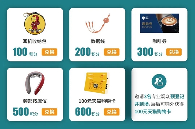注:積分可在展會(huì)現(xiàn)場(chǎng)兌換天貓購(gòu)物卡、頸部按摩儀、咖啡券、收納包等精美禮品