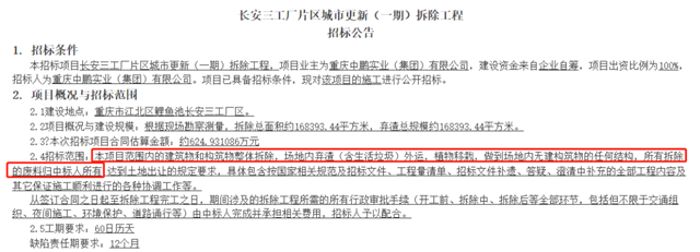 2022年2月23日,重慶中鵬實業(yè)(集團)有限公司發(fā)布了長安三工廠片區(qū)城市更新(一期)拆除工程的招標公告。招標公告稱,拆除總面積約168393.44平方米,棄渣總規(guī)模約168393.44平方米,合同金額約為約624.931086萬元。
