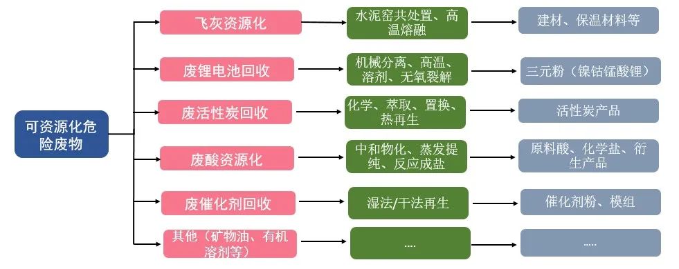盡管無害化處置取得了長足的發(fā)展,但從長遠(yuǎn)看仍然面臨填埋庫容占用、焚燒二次污染控制難、回收不徹底等問題。針對物性簡單、產(chǎn)生量大、有回收利用價值的危廢,應(yīng)優(yōu)先考慮資源化利用。綜合分析市場需求及行業(yè)內(nèi)當(dāng)前熱門資源化利用方向,當(dāng)前聚焦較多的資源化利用技術(shù)主要包括焚燒灰渣利用、廢鋰電池回收、廢活性炭再生、廢酸資源化、廢催化劑再生、污泥貴金屬回收、廢有機(jī)溶劑回收等。