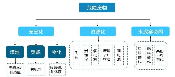 危險廢物的處理處置技術(shù)主要有資源化利用和無害化處置兩大類。無害化處置技術(shù)主要包括焚燒、物化和填埋三種方式,資源化利用技術(shù)則是將含有有效物質(zhì)等的高價值危廢,通過提純等方式將危廢加工成資源化產(chǎn)品進(jìn)行出售。此外,水泥窯協(xié)同處置近幾年逐步發(fā)展壯大,也成為無害化和資源化利用的有效補(bǔ)充。從幾種技術(shù)的特點(diǎn)來看,資源化利用技術(shù)是優(yōu)先技術(shù),焚燒處置是適用性最廣的技術(shù),填埋處置則是最終處置方式。