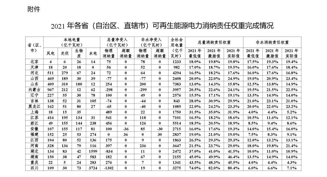 國家能源局關(guān)于2021年可再生能源電力消納責(zé)任權(quán)重完成情況的通報(bào)