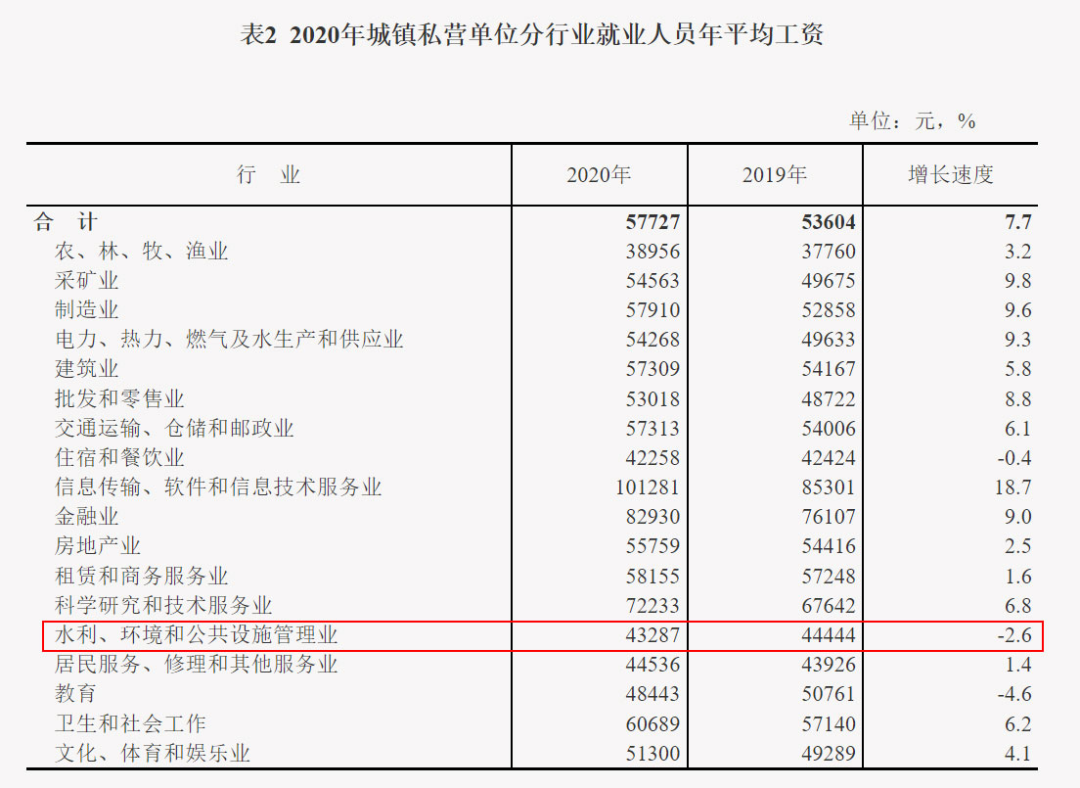 也就是說,主要原因是“部分地區(qū)工資水平較低的環(huán)保、護(hù)林等公益性崗位增加較多”,結(jié)果拉低了行業(yè)整體的工資增長速度。我的理解是,疫情背景下,城鎮(zhèn)非私營單位的環(huán)保崗位增加比較多,同時(shí)工資水平又比較低,所以導(dǎo)致了整個(gè)行業(yè)的收入增速放緩。事實(shí)上,如果把時(shí)間維度再拉長幾年觀察,可以發(fā)現(xiàn)——沒有最慘,只有更慘。比如,今年私營單位的收入增速,環(huán)保行業(yè)是0.2%,這個(gè)增速可以說是夠低了吧?都無限接近于0了。其實(shí),去年更低,數(shù)字竟然是負(fù)的,-2.6%。也就是說,一年忙活下來,環(huán)保行業(yè)的平均工資非但沒有增長,竟然還倒退了2.6%。當(dāng)然,這也與2020年疫情的大背景有關(guān)。出于好奇,小編查了查過去n年國家統(tǒng)計(jì)局發(fā)布的平均工資數(shù)據(jù),結(jié)果發(fā)現(xiàn)了一個(gè)悲慘的事實(shí)。“城鎮(zhèn)私營單位就業(yè)人員年平均工資”這項(xiàng)數(shù)據(jù),從2016年以來,環(huán)保行業(yè)已經(jīng)連續(xù)5年排名倒數(shù)!2021年,0.2%,倒數(shù)第一;