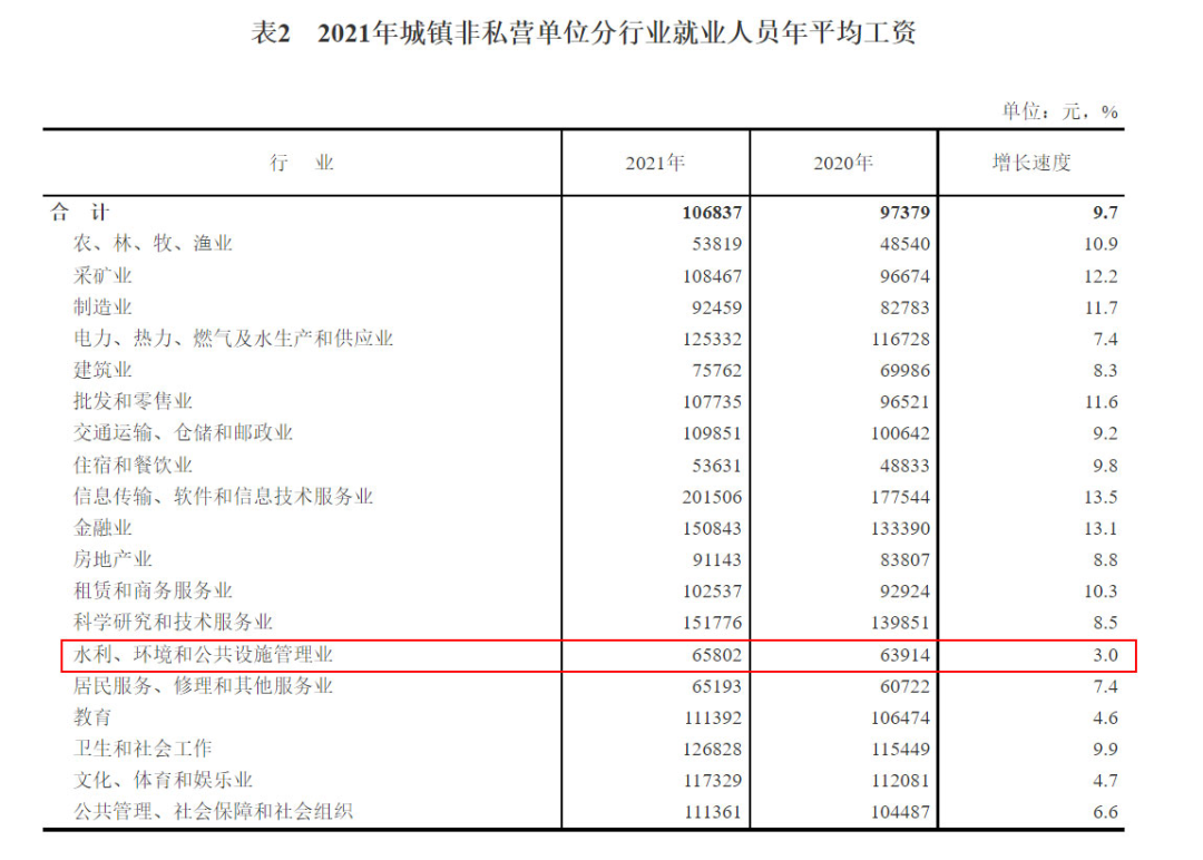 最近兩年,每到4-5月份,環(huán)保行業(yè)日子似乎都不好過。4月前后,年報(bào)發(fā)布季,一大波環(huán)保企業(yè)出現(xiàn)虧損,不好過。5月下旬,國家統(tǒng)計(jì)局照例又要發(fā)布上一年度的平均工資數(shù)據(jù),環(huán)保行業(yè)經(jīng)常排名墊底,又不好過。這不,5月20日,國家統(tǒng)計(jì)局就公布了2021年度的平均工資數(shù)據(jù),環(huán)保行業(yè)首次實(shí)現(xiàn)了收入增速的“雙墊底”(私營單位+非私營單位),增速還不如飽受疫情和政策影響的教育、餐飲和房地產(chǎn)業(yè),實(shí)在令人汗顏。而回顧過去5年,城鎮(zhèn)私營單位環(huán)保行業(yè)的收入增速就一直排名倒數(shù)。2017年倒數(shù)第一,2018年倒數(shù)第一,2019年和2020年倒數(shù)第二,2021年再次倒數(shù)第一,三次“第一”兩次“第二”(全是倒數(shù)),可謂“收入增速增長最緩慢行業(yè)”。為什么出現(xiàn)這一狀況?與環(huán)保行業(yè)的基本屬性有關(guān)。作為一個(gè)關(guān)系國計(jì)民生的重要行業(yè),環(huán)保行業(yè)注定不可能暴利,其業(yè)績的一大特點(diǎn)就是經(jīng)常“增收不增利”,從業(yè)人員的收入自然也就比較低了。5月20日,國家統(tǒng)計(jì)局公布了2021年城鎮(zhèn)單位就業(yè)人員的平均工資數(shù)據(jù)。這項(xiàng)數(shù)據(jù)主要分為3個(gè)榜單——城鎮(zhèn)非私營單位就業(yè)人員年平均工資、城鎮(zhèn)私營單位就業(yè)人員年平均工資,以及規(guī)模以上企業(yè)就業(yè)人員年平均工資。我們主要看的是前兩個(gè)榜單,非私營單位和私營單位的。榜單根據(jù)《國民經(jīng)濟(jì)行業(yè)分類》(GB/T4754-2017)對(duì)各行業(yè)進(jìn)行了分類,環(huán)保行業(yè)屬于其中的“水利、環(huán)境和公共設(shè)施管理業(yè)”。今年的數(shù)據(jù),環(huán)保行業(yè)的最大特點(diǎn)是——首次實(shí)現(xiàn)了收入增速的“雙墊底”:非私營單位收入增速,環(huán)保行業(yè)3.0%,排名倒數(shù)第一;私營單位收入增速,環(huán)保行業(yè)0.2%,排名也是倒數(shù)第一。 而橫向?qū)Ρ绕渌袠I(yè),可以看到——都比環(huán)保行業(yè)好。都說房地產(chǎn)業(yè)這兩年日子不好過,可人家的收入增速也有4.5%;都說教育業(yè)因?yàn)椤半p減”涼涼了,可以人家的增速還有8.5%;都說住宿和餐飲業(yè)受疫情影響最大,可人家的增速竟然有10.8%。你說氣人不?整天哭著喊著的行業(yè)沒啥事,這邊一直默默無聞的環(huán)保行業(yè)一算賬卻來了個(gè)墊底。為啥環(huán)保行業(yè)的收入增速這么慢?官方給出的解釋是——隨著疫情防控成效顯現(xiàn),2021年大部分行業(yè)恢復(fù)性發(fā)展,但旅游業(yè)與景區(qū)收入恢復(fù)較慢,部分地區(qū)工資水平較低的環(huán)保、護(hù)林等公益性崗位增加較多,這些都拉低了水利環(huán)境和公共設(shè)施管理業(yè)的工資增長速度。