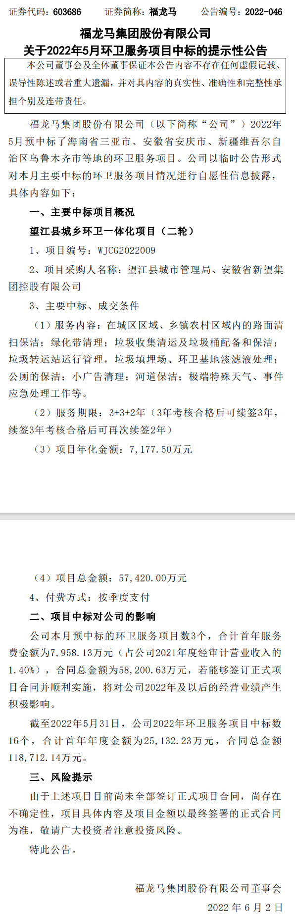 2022年6月2日,福龍馬集團股份有限公司(下稱“福龍馬”)發(fā)布“關(guān)于2022年5月環(huán)衛(wèi)服務項目中標的提示性公告”。