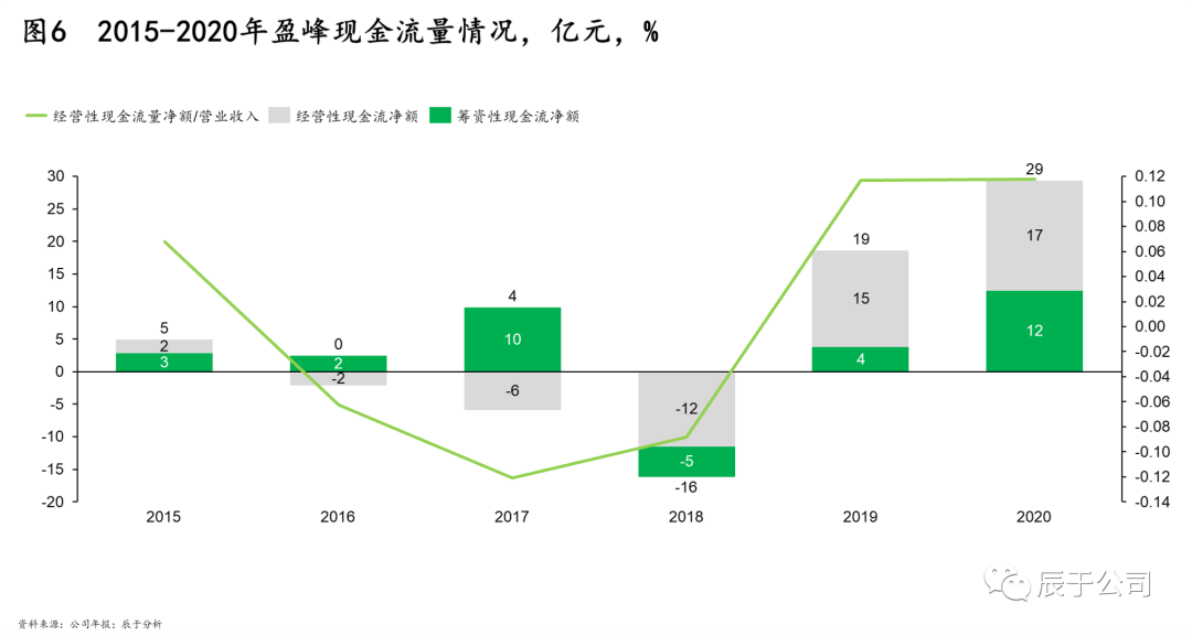 快速調(diào)整的“有進有退”策略不僅讓盈峰環(huán)境的主業(yè)更加突出,也改善了盈峰環(huán)境的經(jīng)營性現(xiàn)金流狀況,近兩年經(jīng)營性現(xiàn)金流及其與營收的比值扭虧為盈,增長顯著(見圖5、圖6)。