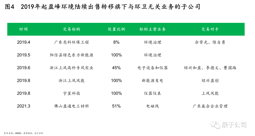 另一方面果斷剝離非環(huán)衛(wèi)相關(guān)業(yè)務(wù)。2019年起,盈峰環(huán)境陸續(xù)出售轉(zhuǎn)移旗下與環(huán)衛(wèi)無關(guān)業(yè)務(wù)的子公司,剝離的主要對象為低利潤或者邊緣業(yè)務(wù),如電磁線業(yè)務(wù)利潤率低,風(fēng)機與環(huán)境治理業(yè)務(wù)市場占有率低,行業(yè)地位低,都不利于公司主業(yè)競爭力的提升;剝離的主要方式為剝離公司而非業(yè)務(wù),以環(huán)境監(jiān)測業(yè)務(wù)為例,雖然宇星科技被剝離,但是雙方明確五年內(nèi),乙方、標(biāo)的公司及宇星科技不得從事環(huán)境監(jiān)測業(yè)務(wù),宇星科技相關(guān)無形資產(chǎn)授權(quán)盈峰使用,不影響公司相關(guān)業(yè)務(wù)繼續(xù)拓展(見圖4)。