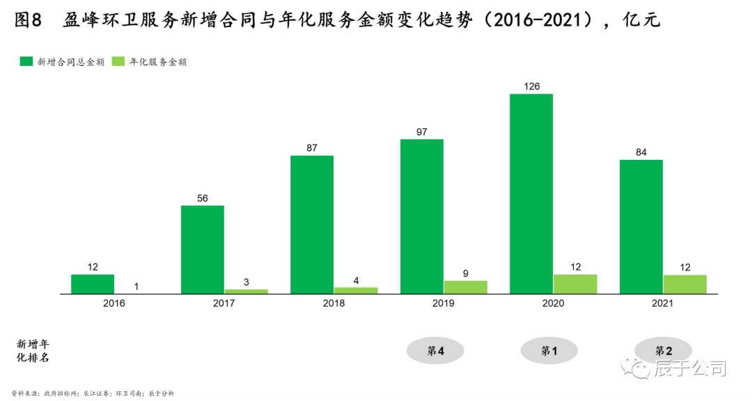 上述“裝備帶動服務(wù)”的業(yè)務(wù)協(xié)同戰(zhàn)略成效顯著,盈峰接連斬獲多個大型環(huán)衛(wèi)項目,如78億的深圳市寶安區(qū)環(huán)衛(wèi)一體化PPP項目、10.3億的淮北市環(huán)衛(wèi)一體化特許經(jīng)營項目等。憑著“拿大單”“拿明星項目”,盈峰的環(huán)衛(wèi)服務(wù)業(yè)務(wù)發(fā)展迅速,近年來在環(huán)衛(wèi)業(yè)務(wù)市場的地位也有了顯著提升(見圖8)。增量來看,2020年,盈峰環(huán)境環(huán)衛(wèi)服務(wù)新增合同總額、新增年化合同額均位列全國前列;存量來看,截至2021年,盈峰環(huán)境運營的環(huán)衛(wèi)服務(wù)項目累計合同總額達到459億,待執(zhí)行合同總額達383億,位居行業(yè)前三,可持續(xù)經(jīng)營能力名列前茅。