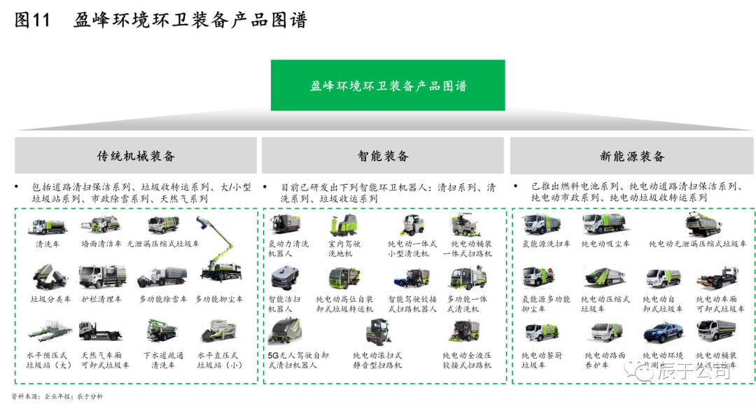 以此為基,盈峰環(huán)境進一步聚焦機械化、智慧化、新能源化三大方向,構(gòu)建了完整的環(huán)衛(wèi)裝備圖譜,涵蓋傳統(tǒng)機械裝備、智能裝備以及新能源裝備等三大領(lǐng)域(見圖11)。
