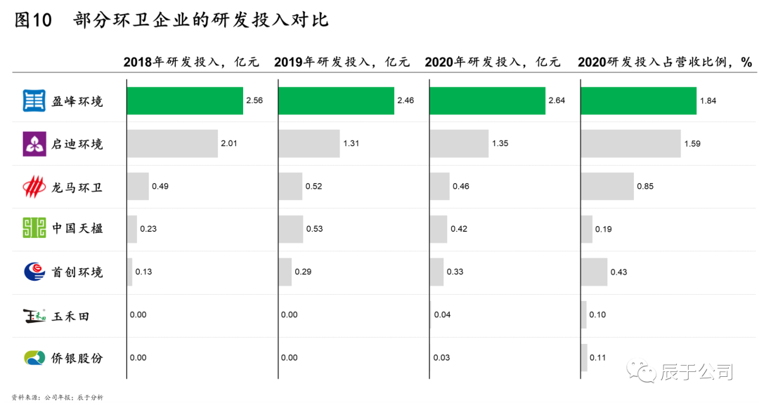 相比其他競爭對手,盈峰環(huán)境在研發(fā)上的投入明顯更大,2018-2020年的研發(fā)投入絕對值一直遙遙領(lǐng)先其他企業(yè),研發(fā)投入占營收比例也明顯更高(見圖10)。