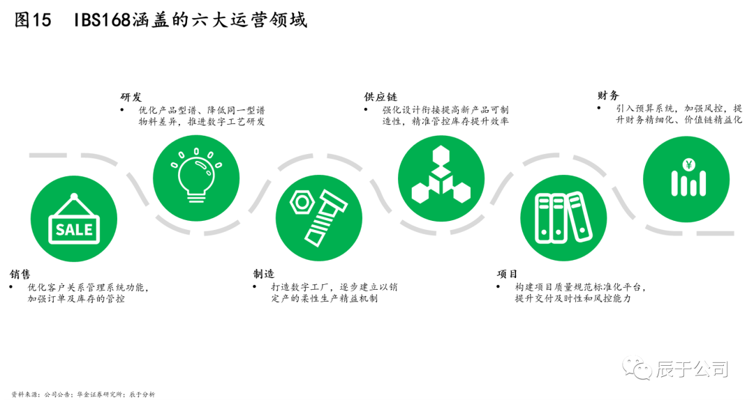 四是管理賦能方面。美的不斷將自身在家電領(lǐng)域的豐富經(jīng)驗賦能給盈峰環(huán)境,例如,盈峰環(huán)境2019年提出IBS168計劃,正是以美的水準打造的數(shù)字化管理系統(tǒng)。該系統(tǒng)的IBS指Infore Business System,構(gòu)建了以市場、客戶為導(dǎo)向的新型訂單預(yù)定模式,建立了內(nèi)外協(xié)同價值鏈的運營體系,覆蓋研發(fā)、營銷、供應(yīng)鏈、財務(wù)、項目、服務(wù)6大運營領(lǐng)域(見圖15),包含產(chǎn)品生命周期、客戶關(guān)系、供應(yīng)商關(guān)系、制造執(zhí)行、企業(yè)資源、設(shè)備管理、組織管理、彈性制造8大管理體系。系統(tǒng)的目的是推動全業(yè)務(wù)的數(shù)字化轉(zhuǎn)型,通過建立數(shù)字化精益制造管理體系,達到產(chǎn)銷、產(chǎn)研的高效對接并實現(xiàn)降本增效,應(yīng)用于盈峰的環(huán)衛(wèi)裝備、環(huán)衛(wèi)服務(wù)和其他固廢等業(yè)務(wù)。
