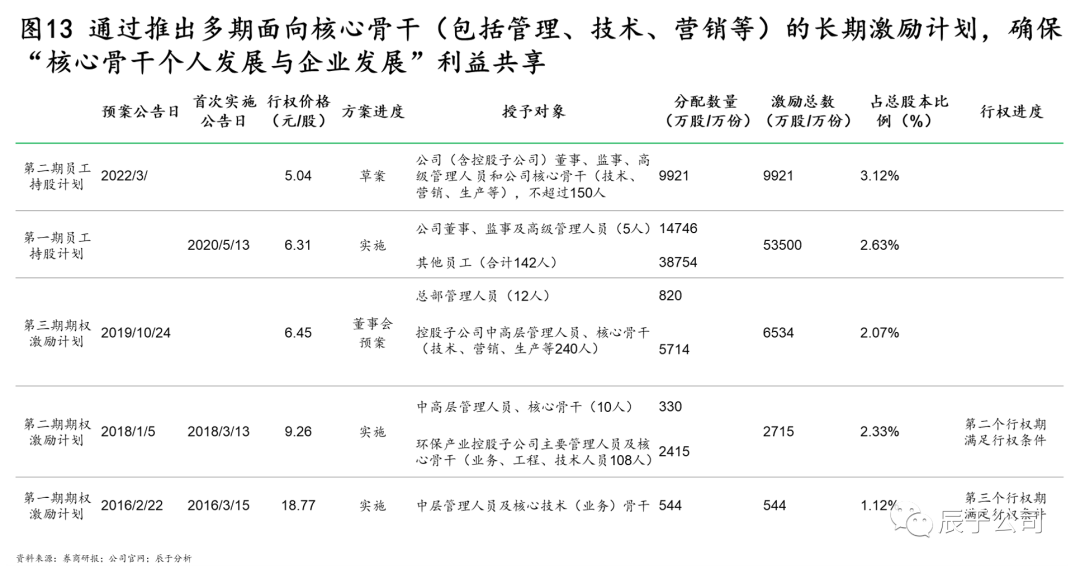 二是政策機制支持方面。盈峰環(huán)境引入美的經(jīng)驗,通過推出多期面向核心骨干(包括管理、技術(shù)、營銷等)的長期激勵計劃,確保“核心骨干個人發(fā)展與企業(yè)發(fā)展”利益共享(見圖13)。
