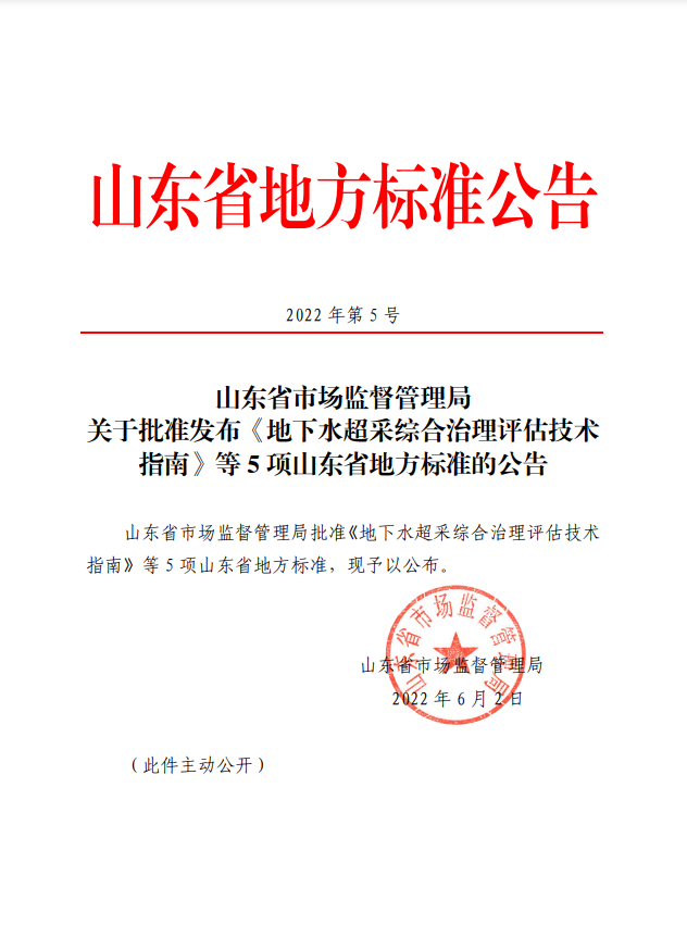山東省市場(chǎng)監(jiān)督管理局關(guān)于批準(zhǔn)發(fā)布《地下水超采綜合治理評(píng)估技術(shù)指南》等5項(xiàng)山東省地方標(biāo)準(zhǔn)的公告
