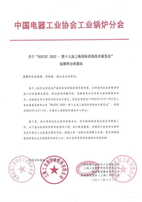 關(guān)于“HEATEC 2022—第十九屆上海國際供熱技術(shù)展覽會”延期舉辦的通知