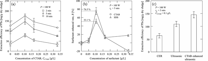 圖2 不同影響因素的提取效率。(a)不同的脈沖超聲時(shí)間下PSs的提取量與CTAB濃度之間的關(guān)系;(b)CTAB和SDS的添加濃度與表面活性劑強(qiáng)化比之間的關(guān)系;(c)三種方法下剩余污泥中高分子物質(zhì)的提取量(來(lái)自原文)